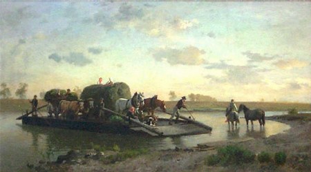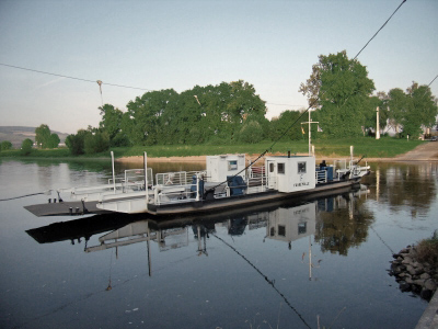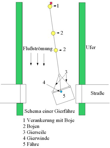 das ist die Funktion einer Gierseilfähre. Grafik: wikipedia Oberleitungsfähren beziehen ihren Strom aus einer Oberleitung wie eine Elektrolok. Schwebefähren müssten eigentlich Hängefähren heißen, denn sie schweben nicht über den Fluss, sondern hängen an Seilen über dem Wasser wie eine Seilbahn.