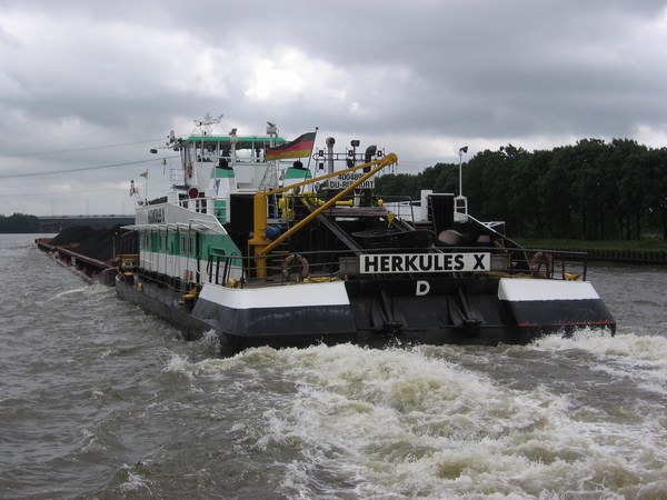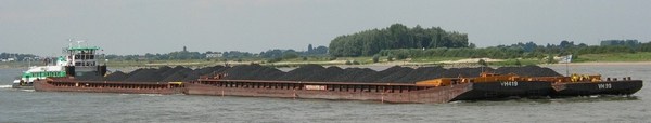 Dieser Koppelverband hat zwei Leichter nebeneinander und zwei Leichter hintereinander. Er transportiert Kohle.