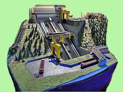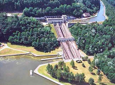 Das ist das Schiffshebewerkr in Arzviller in Frankreich. Auf diesem Bild seht ihr genau wie es funktioniert. Oben rechts seht ihr den Kanal. Das ist der Rhein-Marne-Kanal. Er hört am Hebewerk auf. Dann fahren die Schiffe in die Wanne und die Wanne wird seitlich, ganz langsam, von oben nach unten gezogen. Wenn die Wanne mit den Booten unten angekommen ist, können sie ausfahren und der Kanal geht weiter. Hier seht ihr das Hebewerk nochmal auf einer Zeichnung und hier als Modell.