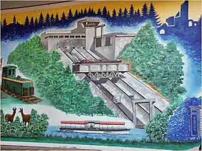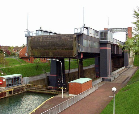 Dass es Kanäle gibt, die über Berg und Tal führen, das habe ich euch ja schon erzählt. Und dass man dafür Schleusentreppen gebaut hat, das konntet Ihr ja bei "Schleusen" sehen. In einer Schleusentreppe zu schleusen, war natürlich für die Schiffsleute sehr anstrengend und es hat auch sehr lange gedauert. Schließlich mussten sie ja immer wieder warten, bis die Schleuse voll war, sich geleert hat, die Tore sich geöffnet haben und bei der nächsten Schleuse das gleiche noch mal. Es gibt Schleusentreppen mit 20 Schleusen hintereinander. Um sich die Arbeit ein bisschen leichter zu machen hat man statt der Schleusentreppen ein Schiffshebewerk gebaut. Eigentlich funktioniert es genauso wie eine Schleuse. Es gibt ein Becken mit Toren auf beiden Seiten. Der Unterschied zu einer normalen Schleuse ist, dass das Boot in das Becken einfährt und dann das ganze Becken nach unten oder nach oben bewegt wird.