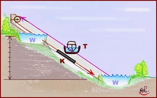 T =Trog ... K =(Kontergewicht) Gegengewicht ... W =Wasserläufe ... Und so hat Rolfdieter es für Euch gezeichnet. Das ist ein Schräg-Hebewerk, auch Schrägaufzug genannt. Ein Hebewerk kann auch senkrecht heben, das sieht dann so aus: Schiffshebewerk Henrichenburg