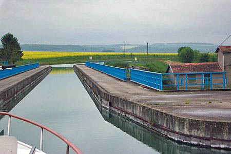 Kanäle die querfeldein laufen, müssen oft auch ein Tal, einen Bach oder eine Straße überqueren. Dazu braucht man Kanalbrücken. Sie sind genauso wie Brücken für Autos, nur dass Wasser darin ist und Boote darin fahren. Es ist ein tolles Gefühl, wenn man so von oben auf die Autobahn gucken kann. Diese Kanalbrücke überquert einen Bach. So sieht das aus, wenn man mit dem Boot auf eine Kanalbrücke fährt.