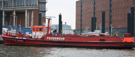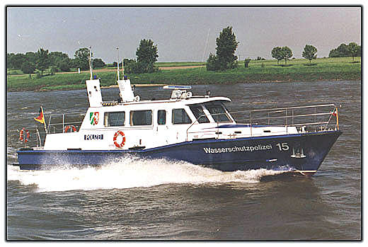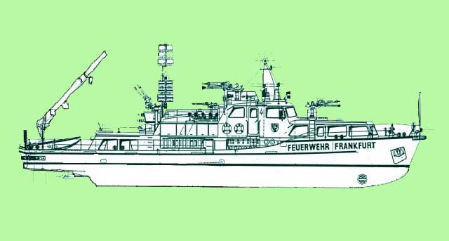 Wie auf dem Land, gibt es auch auf den Flüssen und Seen Polizei. An Land fahren sie Polizei-Autos, auf dem Wasser haben sie natürlich Schiffe. Die Polizei kontrolliert die Berufsschiffer und die Sportbootfahrer. Sie passt auf, dass jeder Schiffsführer seinen Führerschein dabei hat. Auf einem Berufsschiff heißt das nicht Führerschein, sondern Patent. Ist aber eigentlich das Gleiche. Und sie kontrolliert auch, ob alle Boote und Schiffe die Sicherheitsausrüstung an Bord haben. Also Schwimmwesten, Verbandskasten und einen Rettungsring. Aber auch Anker, Bootshaken und ein Eimer oder eine Pumpe zum Wasser aus der Bilge zu schöpfen gehören dazu. Neubau . der Meidericher Schiffswerft, Duisburg". Auch auf dem Wasser kann es einmal brennen. Dann braucht man ein Feuerwehrboot. Das ist die Zeichnung des Feuerwehrbootes, das am Main im Einsatz ist. Das komische Ding am Heck ist ein Kran. Er kann 10 Tonnen heben. Besonders groß ist die Brandgefahr in einem Hafen, wenn die Schiffe be- und entladen werden. Deshalb hat jeder große Hafen auch ein Feuerwehrboot. Das ist immer besetzt und wartet auf einen Einsatz. Die richtige Bezeichnung für ein Feuerwehrboot ist Löschboot.