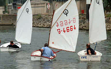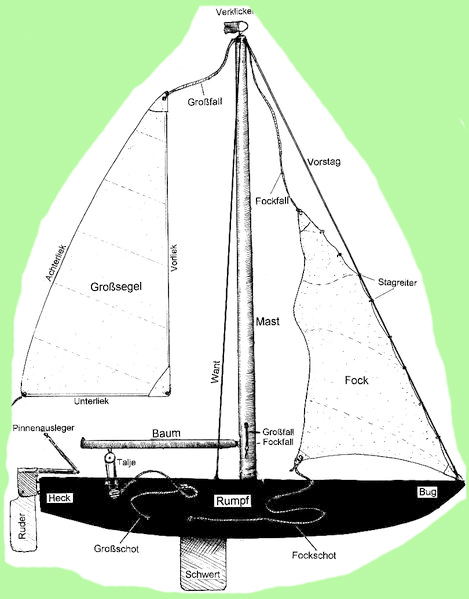 Illustration Reinhard Habeck Caro erzählt Euch etwas über Segelboote für mehr Infos klickt auch auf die Bilder Es gibt ganz kleine Segelboote, die haben nur einen Mast und ein Segel und alle Kinder lernen darauf segeln, der Optimist (Opti-Segeln im Ingelheimer Hafen mit den alten Herren) mein Papa hat auch auf einem Opti segeln gelernt Es gibt aber auch noch andere kleine Segelboote, die nennt man Jollen, und wenn sie eine Kajüte haben, dann heißen sie Jollenkreuzer. Jollen und Jollenkreuzer sind zwar auch nicht besonders groß, aber sie haben schon zwei Segel, ein Vorsegel und ein Großsegel. Warum die so heißen, das seht ihr ja selbst. Zeichnung von Pavel Krok (Wikipedia)