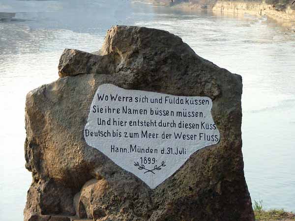 Dieses Schild steht auf einem Gedenkstein auf der Insel, an der Werra und Fulda zusammenfließen.